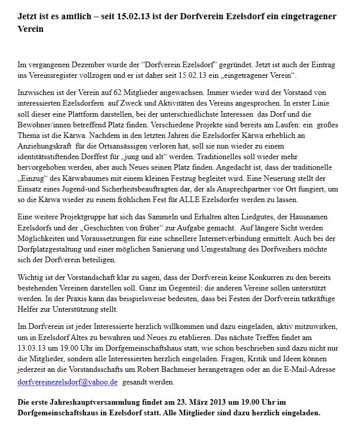 Jetzt ist es amtlich seit 15.02.2013 ist der Dorfverein Ezelsdorf ein eingetragener Verein
